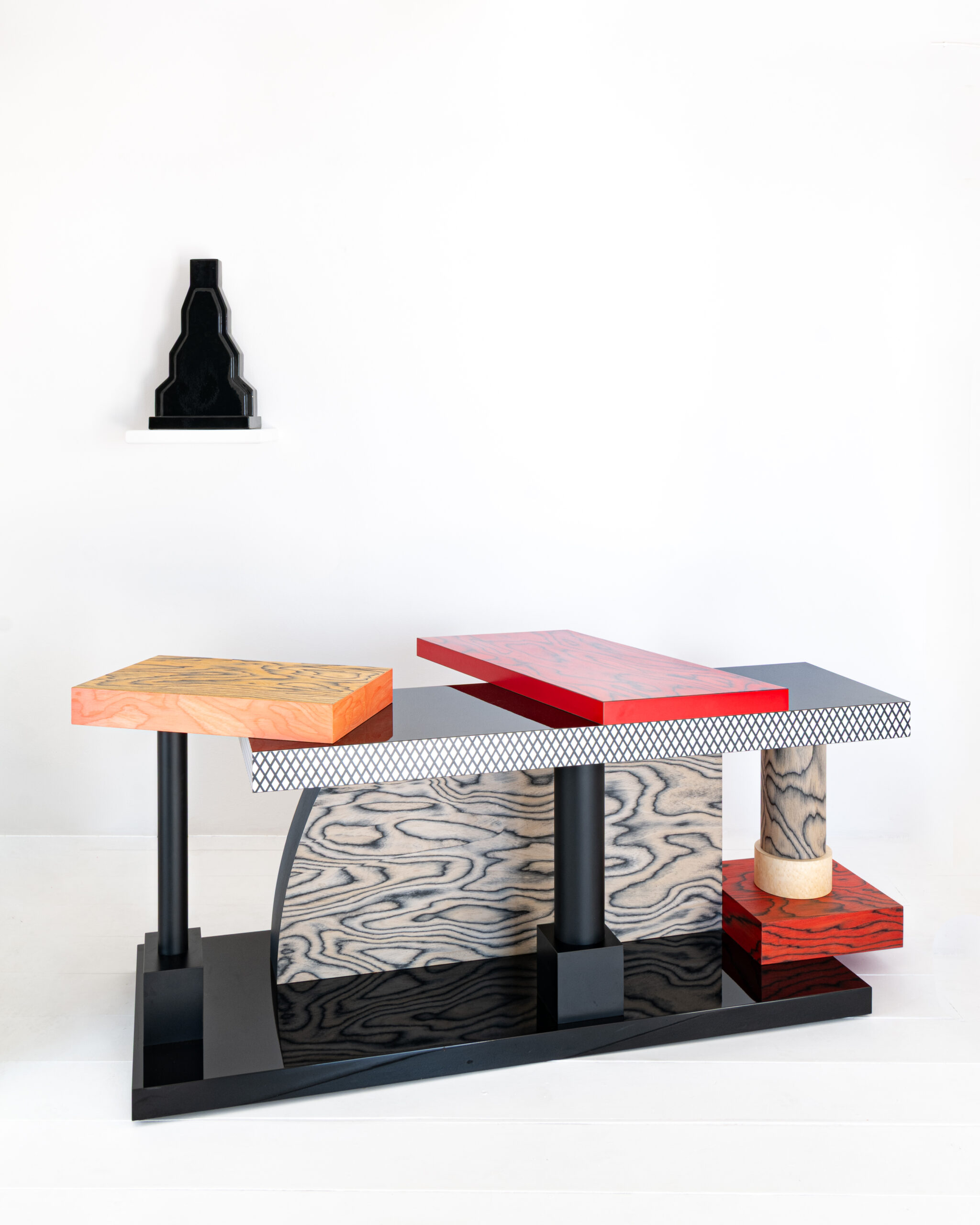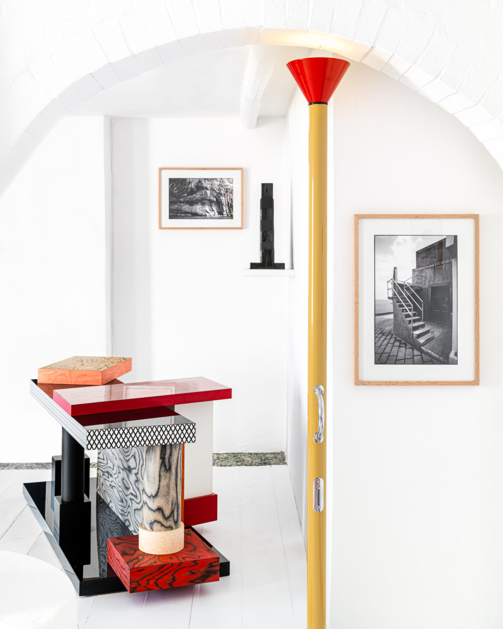 In July 2025, Studio Casoli, an art gallery on the beautiful and enigmatic Filicudi, hosted an exhibition dedicated to Ettore Sottsass. On the island that became a “summer refuge” for Ettore Sottsass and his life companion, this exhibition also includes Tartar, designed by the master himself in 1985. This bold and intricate console embodies Sottsass’ distinctive style: playful assemblages of geometric forms, wild juxtaposed patterns, and a surprising mixture of luxurious and decorative materials.